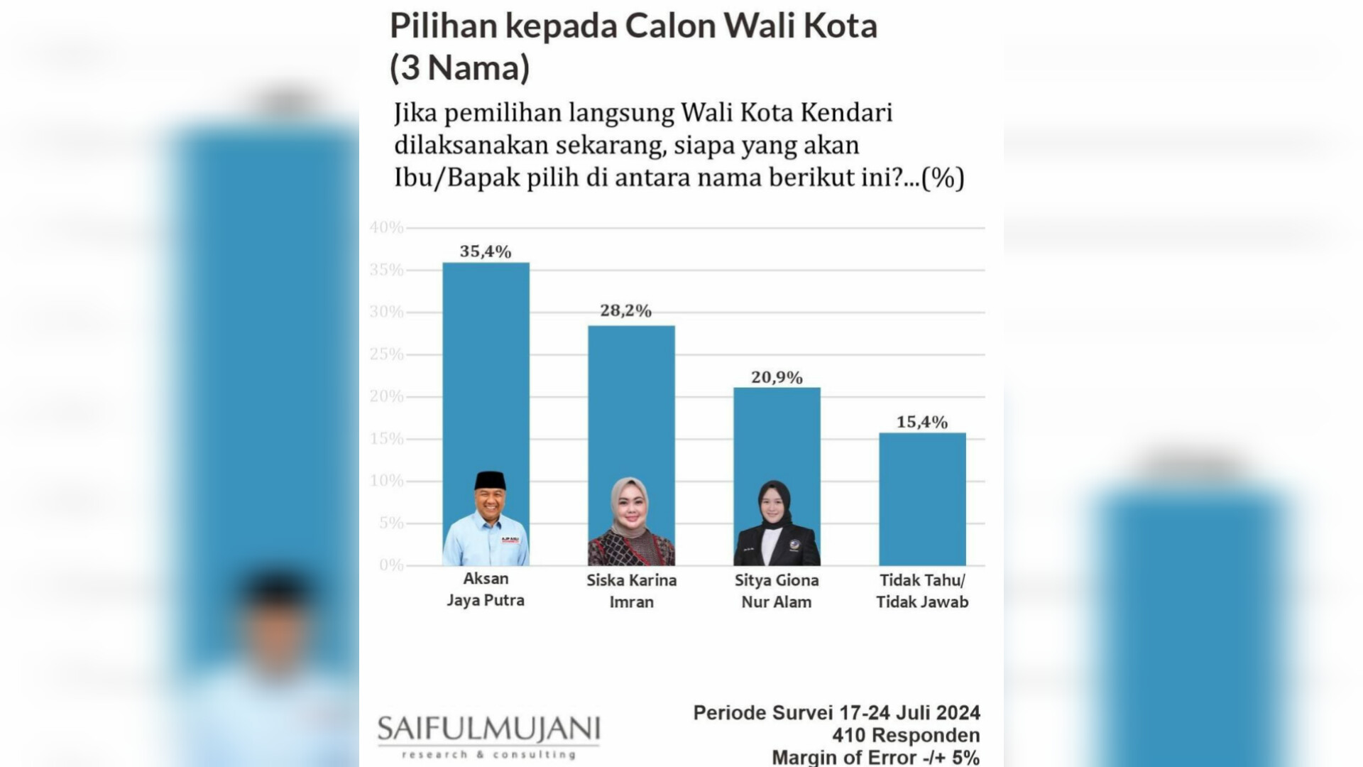 KENDARI, LONTARASULTRA.COM – Survei bakal calon Wali Kota Kendari, Aksan Jaya Putra (AJP) semakin memuncak. Terbaru, hasil survei Saiful Mujani Research dan Consulting (SMRC) yang diperoleh, AJP unggul telak dari pesaingnya di semua simulasi.