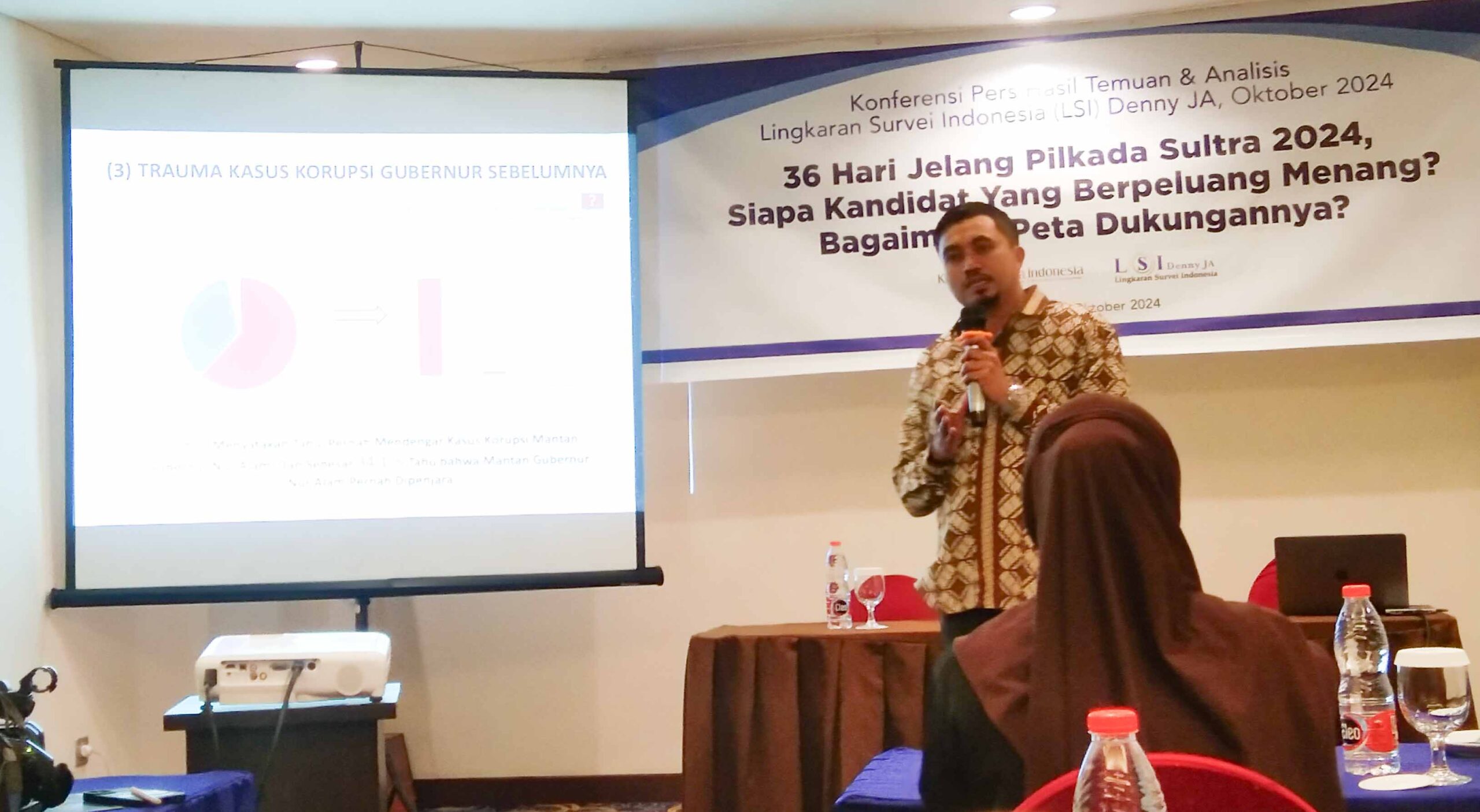 Direktur LSI Denny JA, Adjie Alfarabi dalam paparannya menjelaskan, menjelang Pilkada 2024, salah satu kriteria calon gubernur yang dianggap paling penting bagi masyarakat Sultra adalah bersih dari isu korupsi.