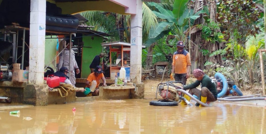 Warga mulai berbenah. Rumah-rumah yang sebelumnya terendam kini warga mulai membersihkan dari lumpur tebal dibantu dengan BPBD dengan menyemprotkan air bertekanan tinggi menggunakan pompa mesin air.